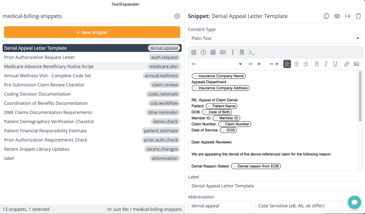 A fill-in Snippet for denial appeal letters might prompt for patient name, date of service, claim number, specific denial reason, and supporting documentation references. Staff complete these prompts, and TextExpander generates a complete, professionally formatted appeal letter that includes all required elements in the payer’s preferred format.