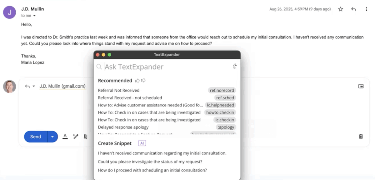 Finding the right content no longer requires memorizing abbreviations or searching through folders. With a single keystroke, TextExpander AI uses the text around your cursor and suggests the right Snippet from your library, even if you have thousands of Snippets. As J.D. explains, “AI doesn’t replace your Snippets, but it does help you find and expand them more easily. Imagine the perfect Snippet for the situation just showing up automatically.”