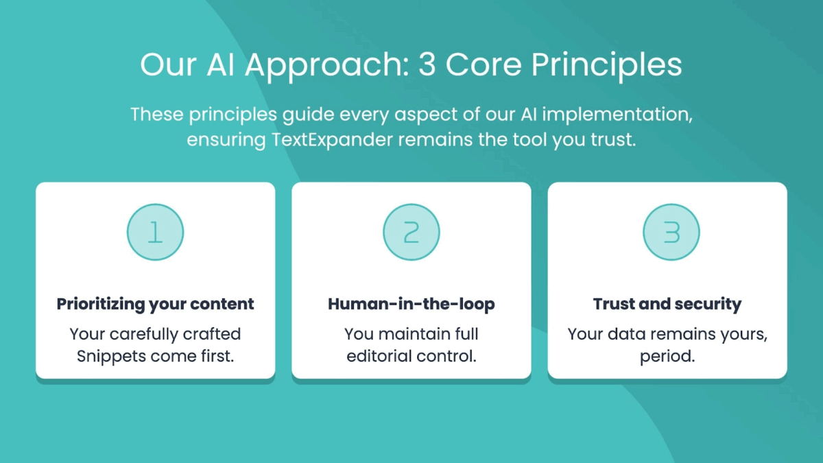 Introducing AI into TextExpander isn’t about chasing trends. Rather, it’s about strengthening the foundation of how people and teams already work. To ensure AI amplifies productivity without sacrificing trust, we’re building around three core principles: