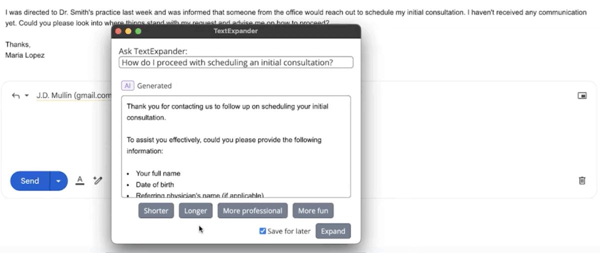 When the Snippet you need doesn’t exist yet, TextExpander AI can can help you create it. The system generates prompts based on what you’re working on, then produces a first draft you can refine, personalize, and save to your library for future use if desired.