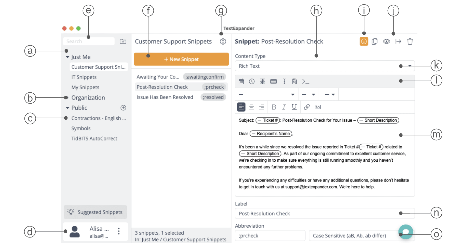 o. Abbreviation and Case Sensitivity: Create the series of characters you’ll type to expand your Snippet. Organize your Snippets by selecting an abbreviation scheme. With case sensitivity, your Snippet will adapt to the casing you want once expanded or the case of the abbreviation. Works best for Snippet that are single words.