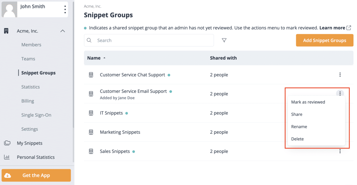 To help you differentiate between existing Organization Snippet Groups and new ones, you’ll see a teal dot next to new Snippet Groups. This dot signifies the Snippet Group has not yet been reviewed by an administrator and gives you a chance to edit or delete it.