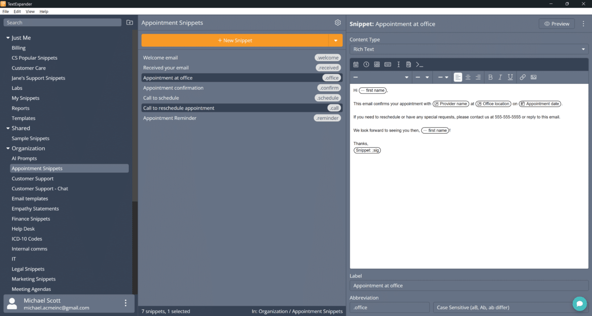 - TextExpander will follow your selection immediately.